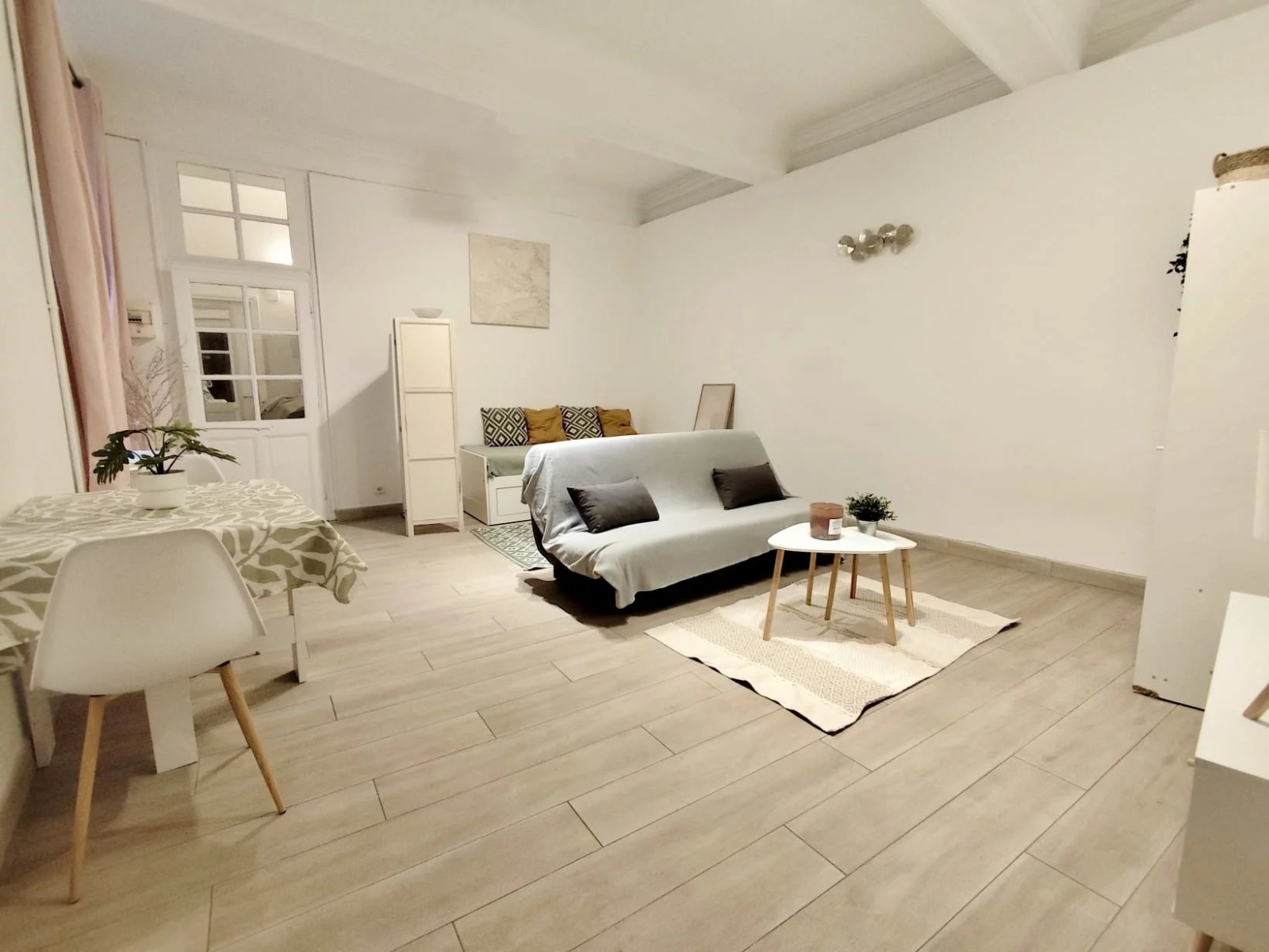 - d'une grande pièce à vivre avec un lit gigogne (de une à deux places), un canapé, table à manger, armoire ...