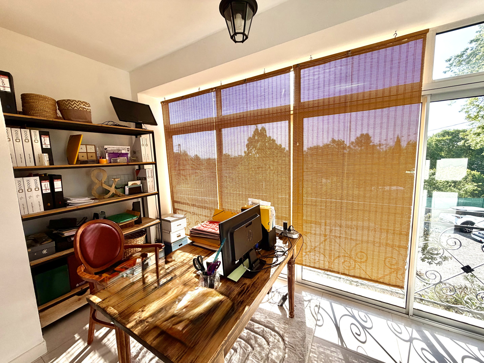 - Au rez-de-chaussée d'une entrée, d'une pièce pouvant servir de bureau, d'une vaste cuisine équipée ouverte sur le séjour, d'une salle d'eau, d'un toilette indépendant et d'une buanderie-cellier.